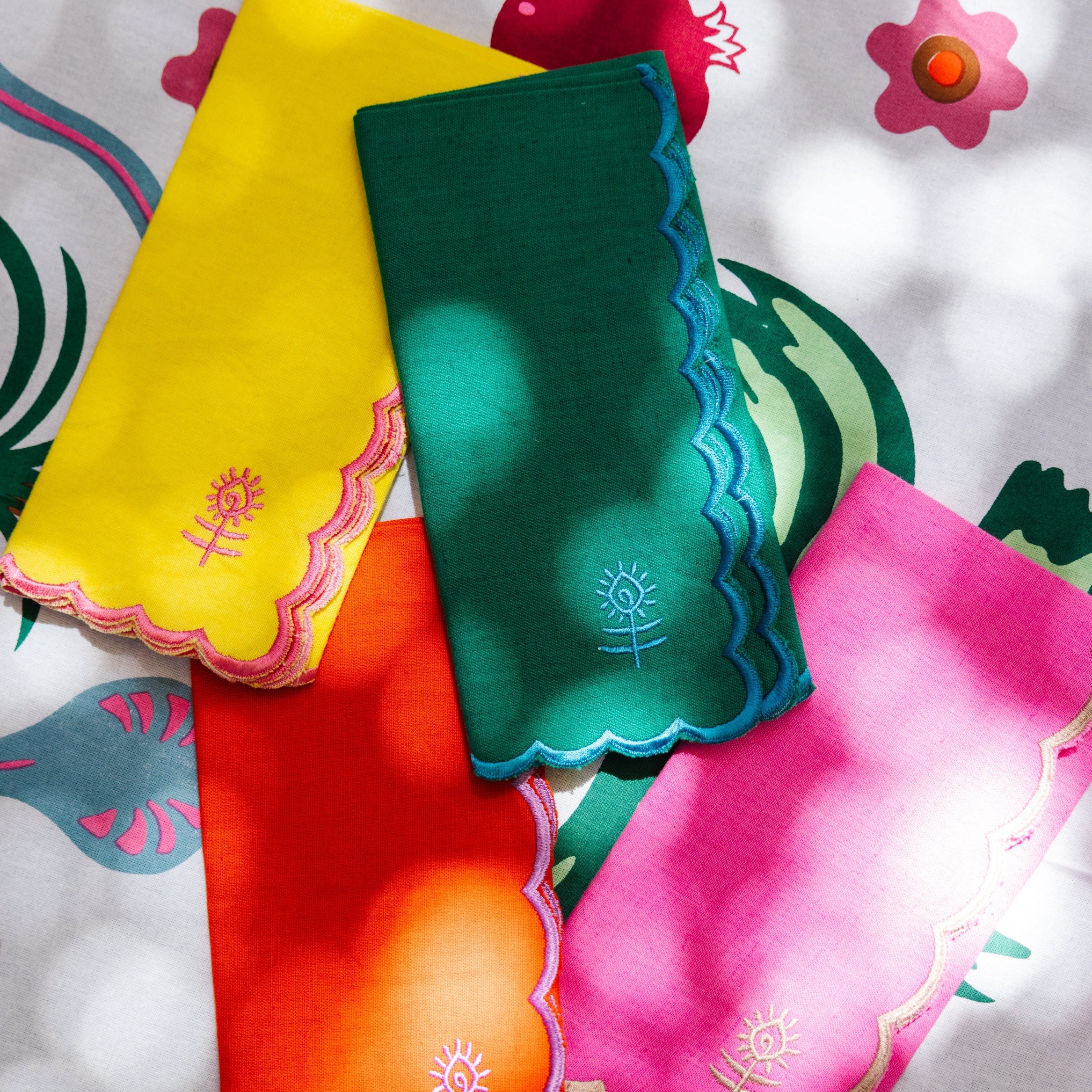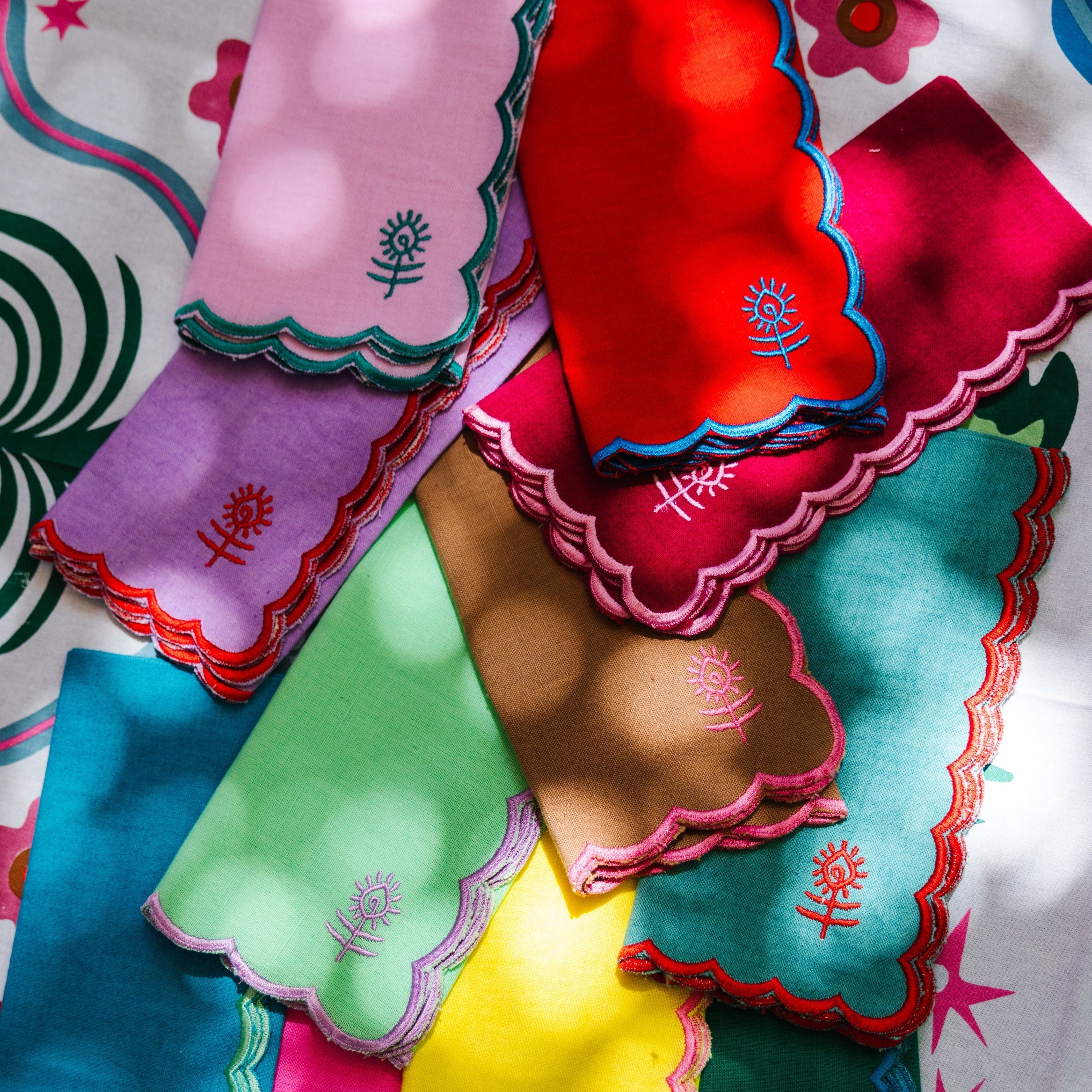 Exclusive to Furbish, these scalloped linen napkins are an entertaining go-to. Crisp luxe linen with coordinating contrast trim, and a charming embroidered logo in the bottom corner.