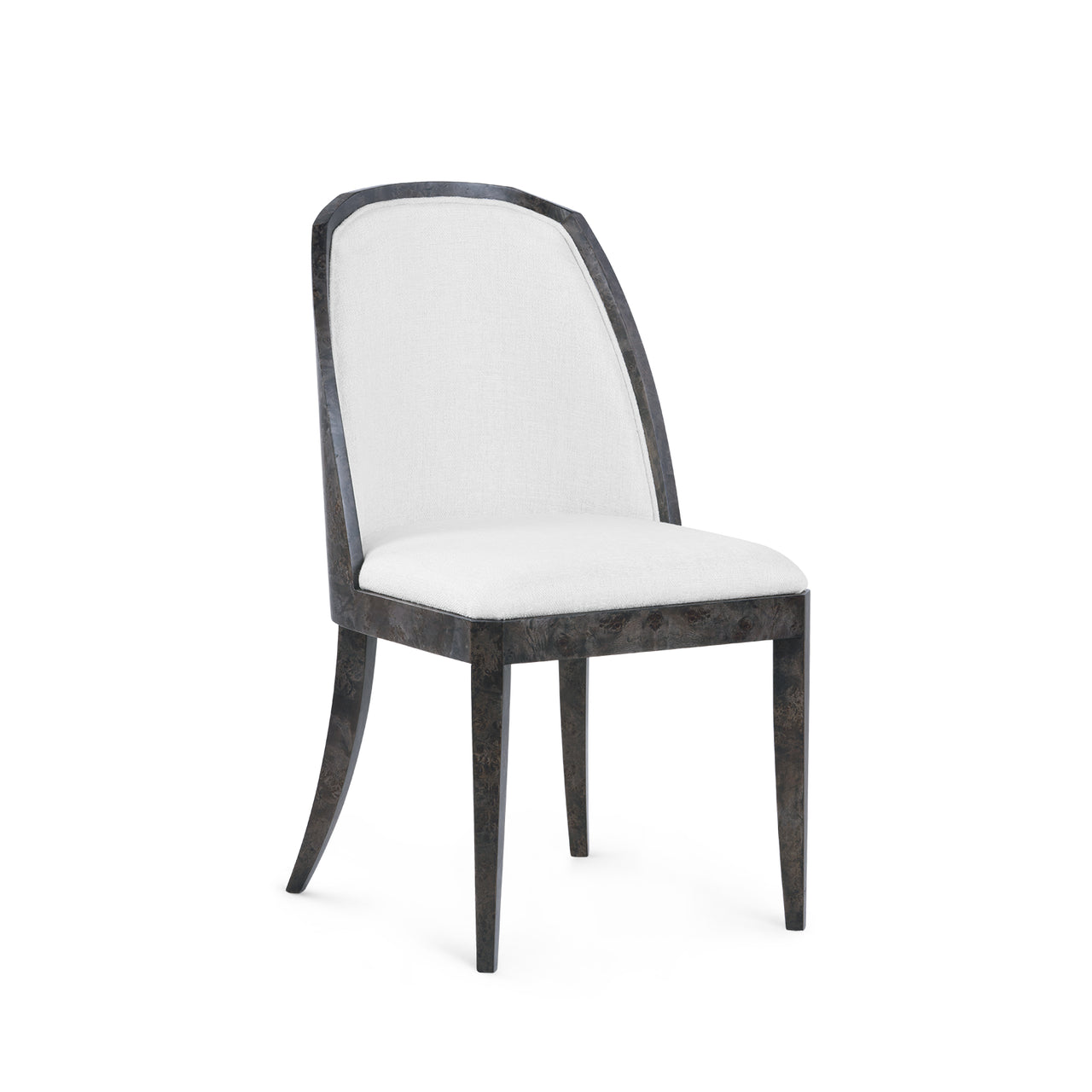 The Ophelia Chair is a striking piece crafted from luxurious burl, offering both beauty and substance. Larger in scale than many of our side chairs, it features a generous seat that ensures comfort without compromising on elegance. The backrest is fully veneered with a graceful curve, complemented by a subtle angularity at the top for added character. Upholstered in a flatwoven fabric reminiscent of shaved chenille, the chair exudes a refined softness. The legs are a testament to thoughtful design: the back legs sweep gently, while the front legs are angled with straight fronts and subtly curved backs for a dynamic yet balanced silhouette. The Ophelia Chair is a masterful blend of comfort, craftsmanship, and style.