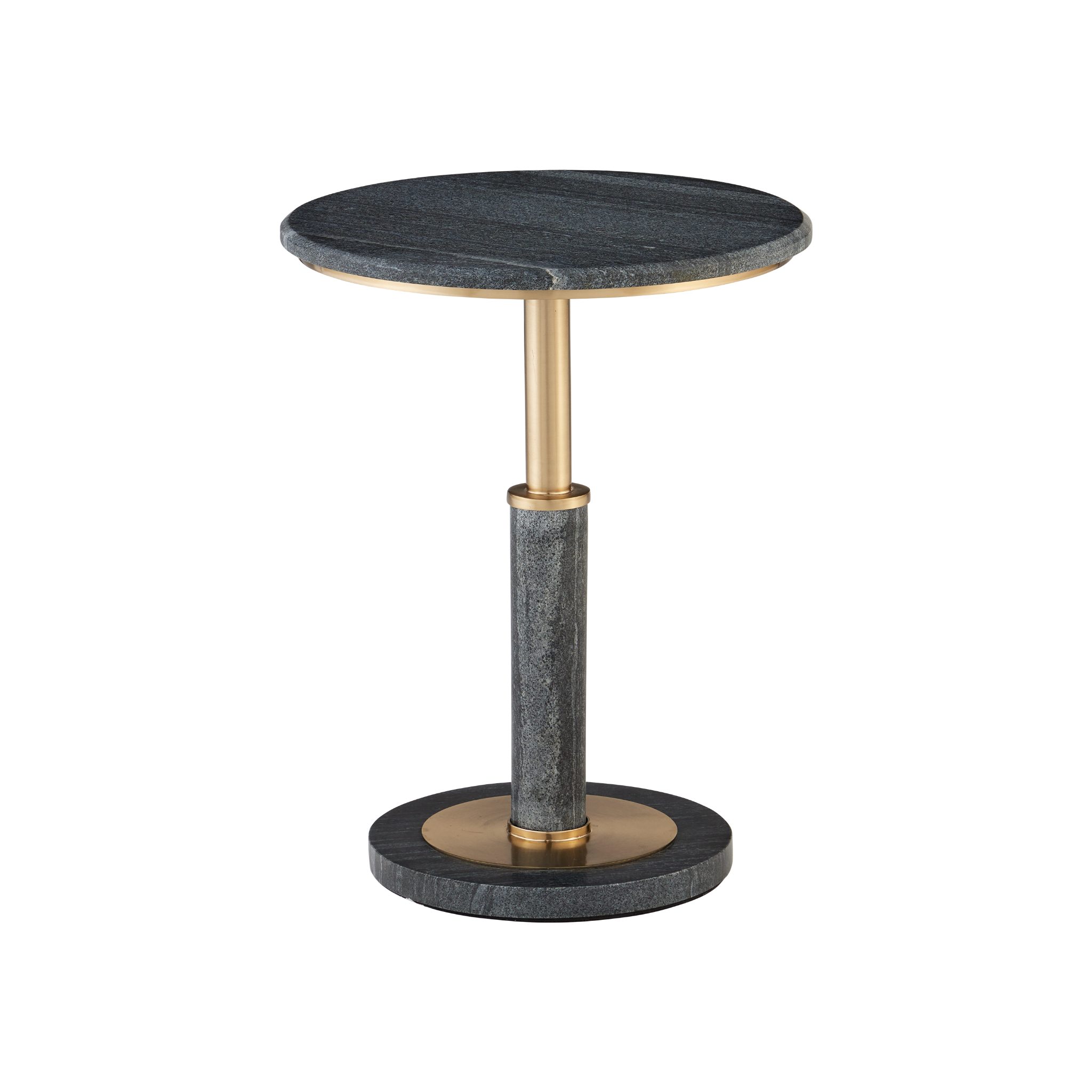 The Prado Black Marble Drinks Table is a geometrically rich intermingling of Midnight black stone and metal in a polished brass finish—discs and rods form the shapes that are layered from a stacked base to the stone tabletop. The veining in the natural material is textural while the metal is machined smooth. Because the stone is a natural material, the surfaces will vary from table to table.