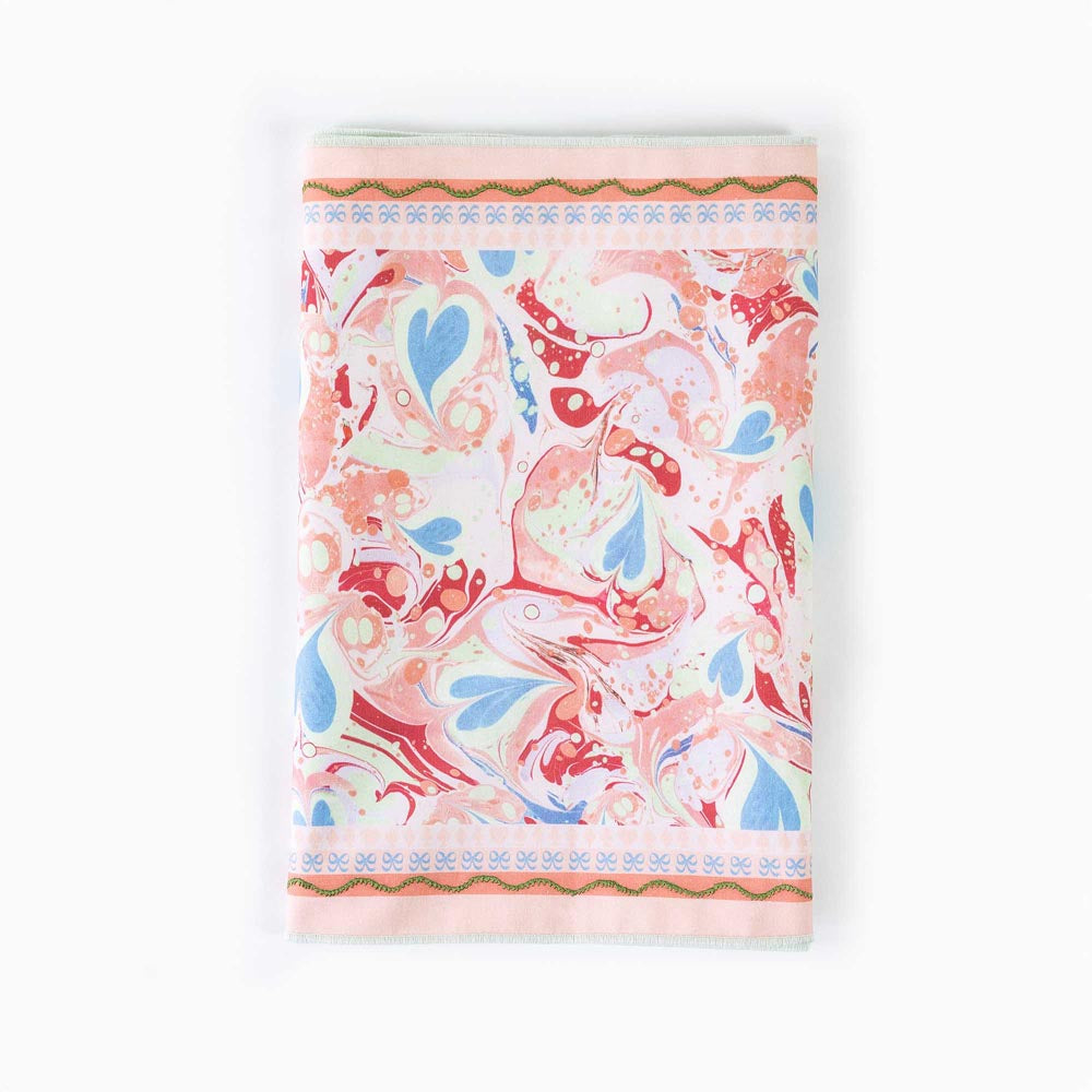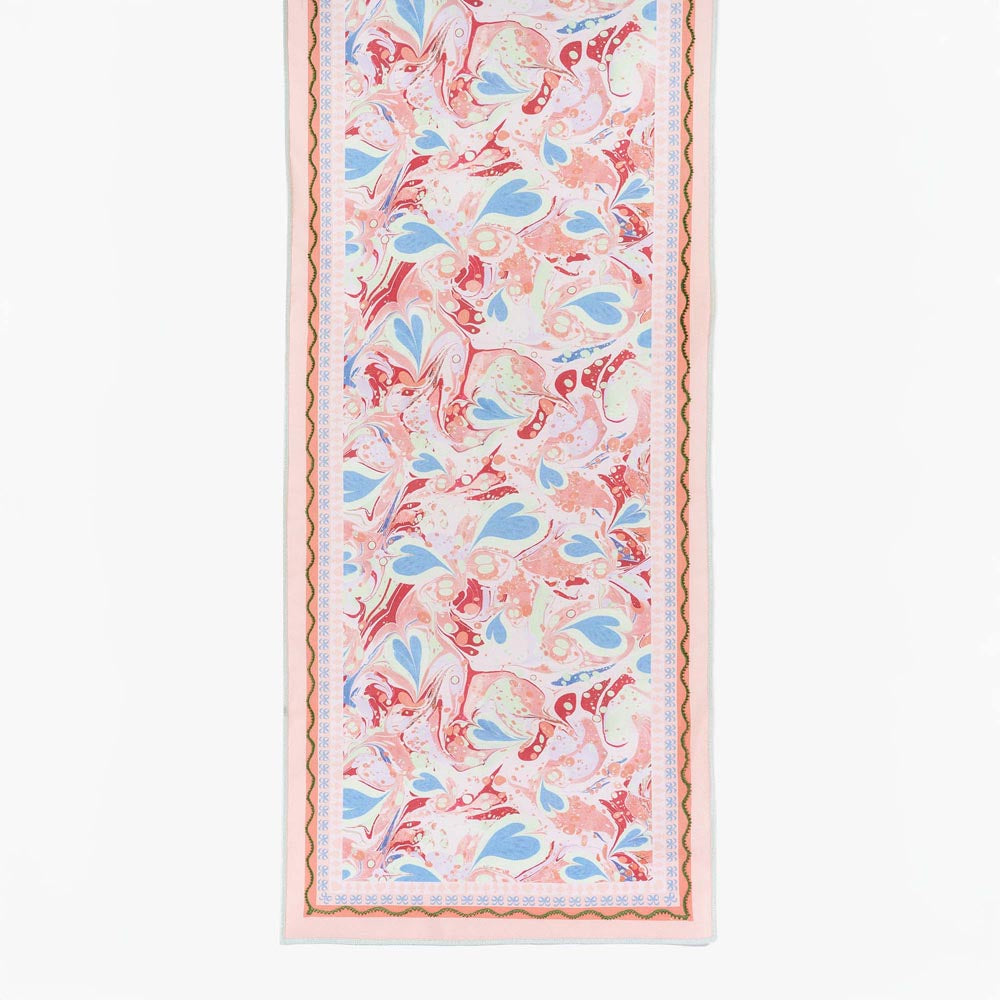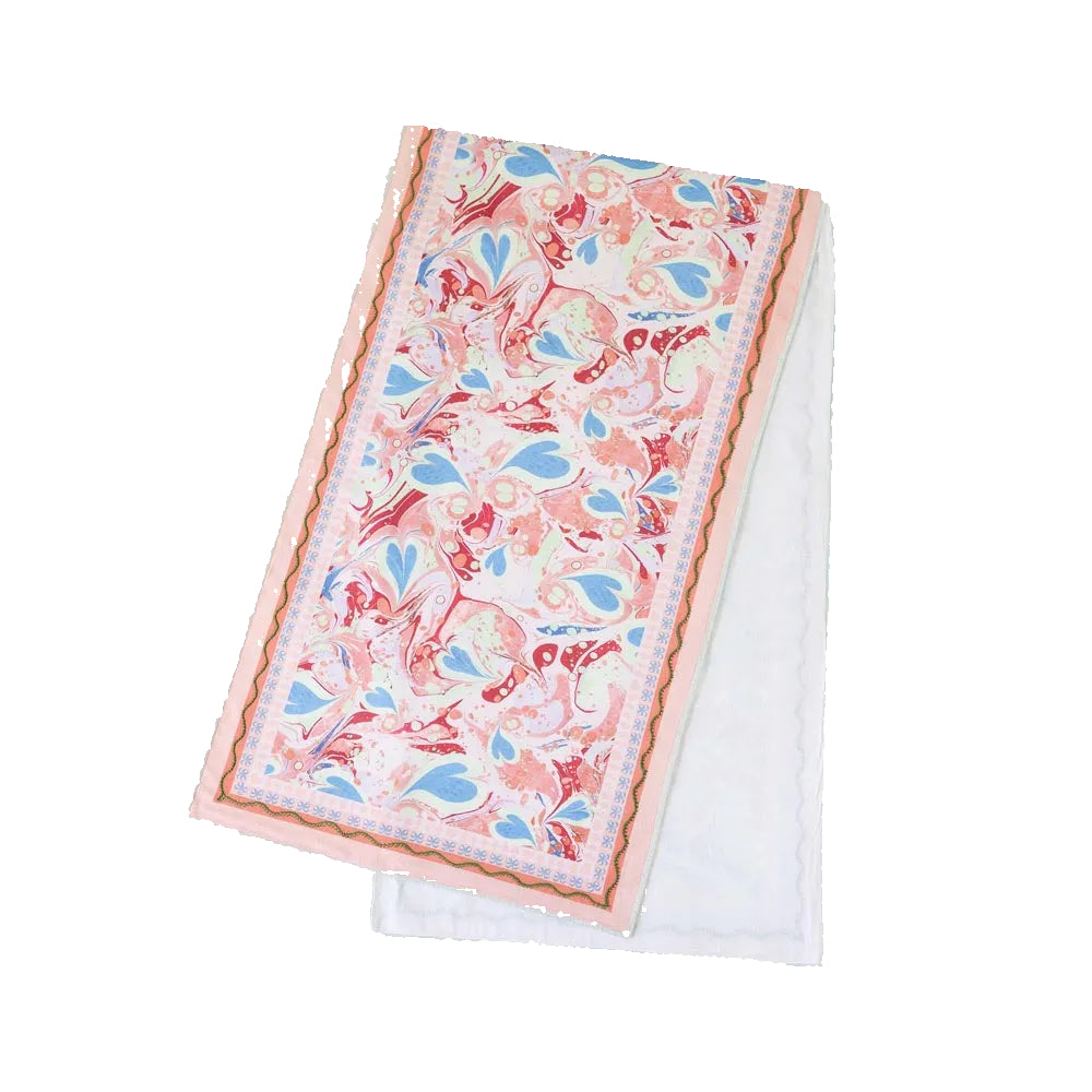 The Table Runner features the original marbled paper pattern created by Tara Roma Gill for the Alice in Wonderland Art Novel. Resplendent in blush pinks, corals, and striking crimson, with delicate accents of sky blue and mint green hearts, her playful yet elegant use of color channels the curious spirit of the character we all know and adore.