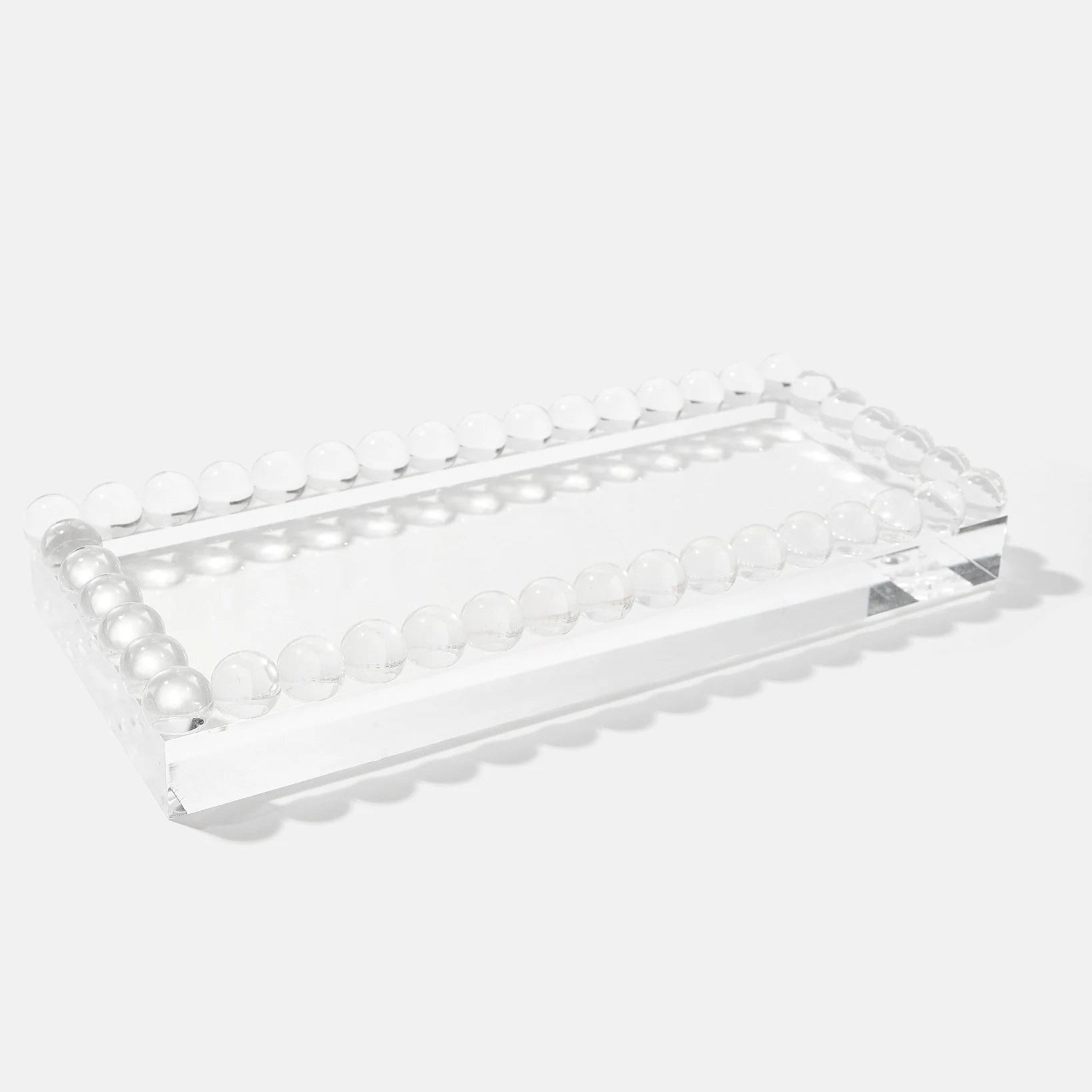 Our large Bubble Large Lucite Tray is the biggest of the collection, giving you plenty of room to style and organize. It perfectly fits three bottles of soap or lotion, or try two bottles with a scrub brush for a polished sink setup. Beyond the bathroom, it doubles as a chic display for jewelry, perfumes, or even guest towels. With its clear acrylic and playful bubble trim, this tray is both practical and stylish, making it the ultimate statement piece for any space.