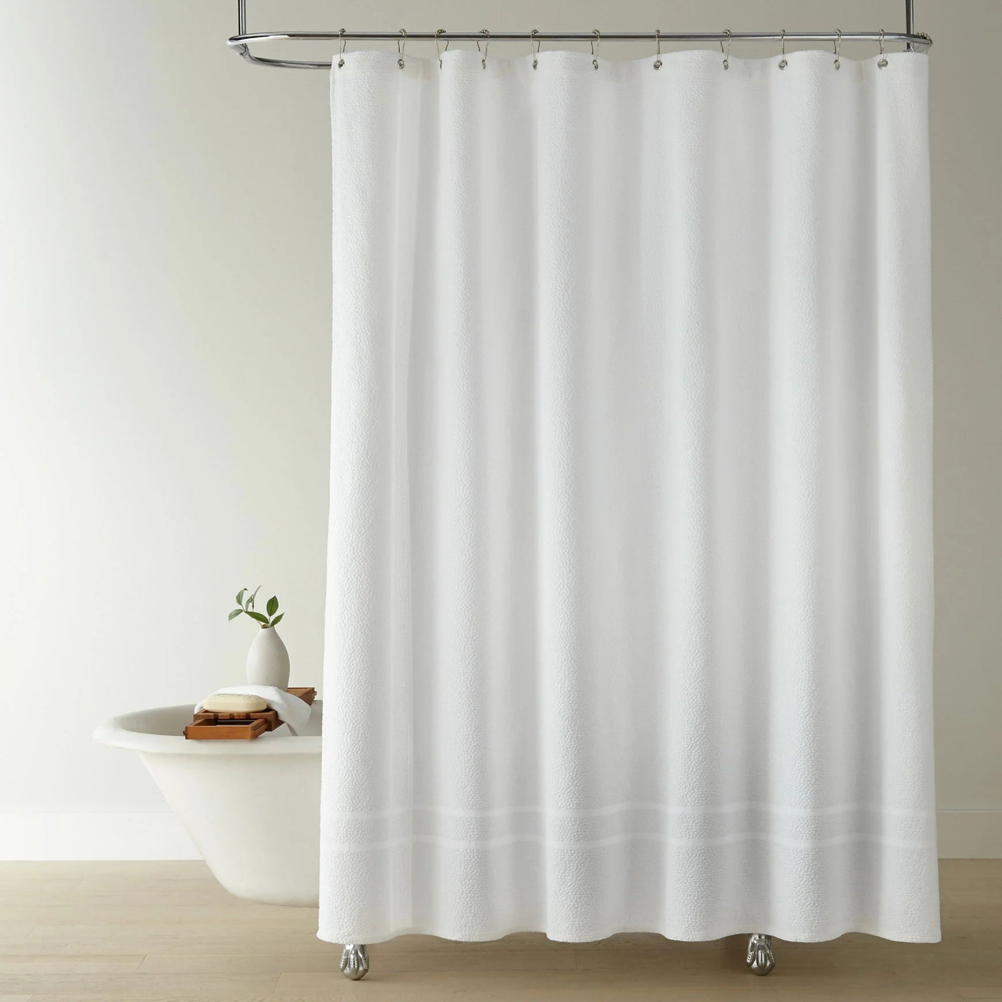 Freshen up your bathroom with something classic and clean. Our beloved Montauk is now available in chic shower curtain. Handcrafted in Portugal from 100% cotton, its elevated frame design with pebble texture and rust-free silver grommets add a zen-like aesthetic to your sanctuary.