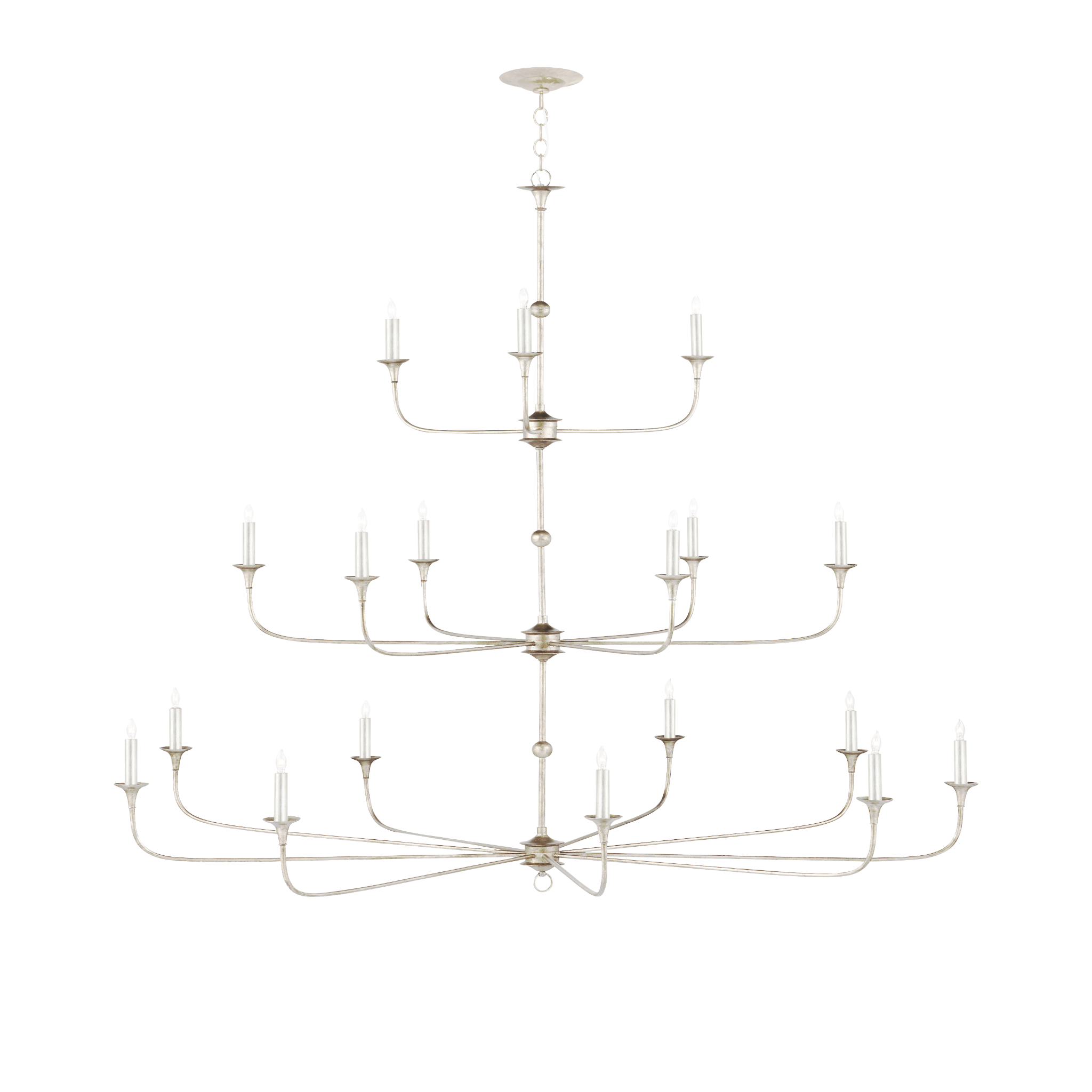 The arms of the Nottaway Grande Champagne Chandelier stretch gracefully from petite cogs that rest at three points on its long, thin stem, the bottom one ornamented with a dainty ring. Though the silver chandelier has minimalist lines, there is a sweeping fluidity to its profile that makes it a natural choice for large tall foyers or any room with high ceilings. The finish on the wrought iron frame brings textural interest to this dimmable 18-light fixture.