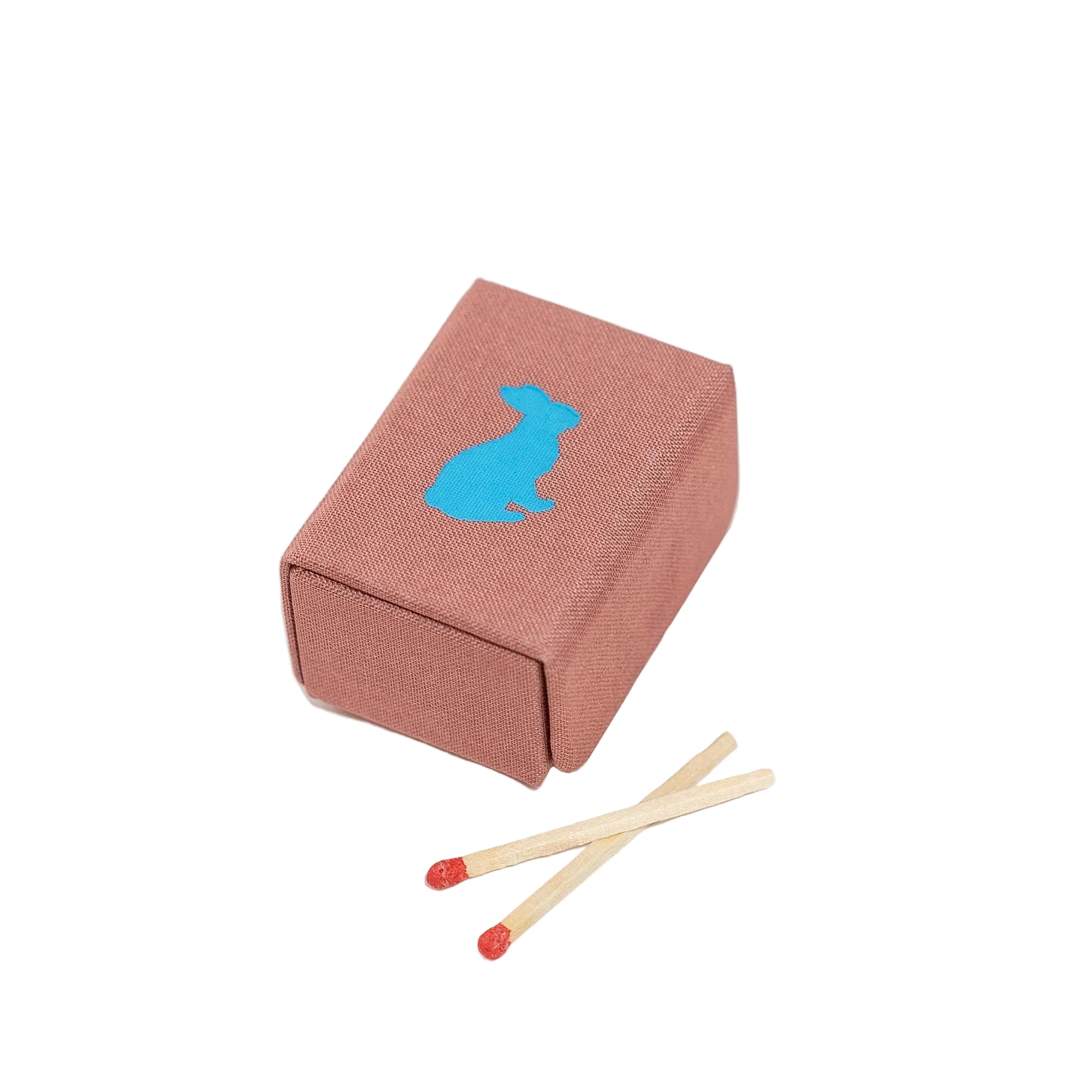 - Bookcloth-wrapped matchbox in vintage rose with powder-blue foil stamping