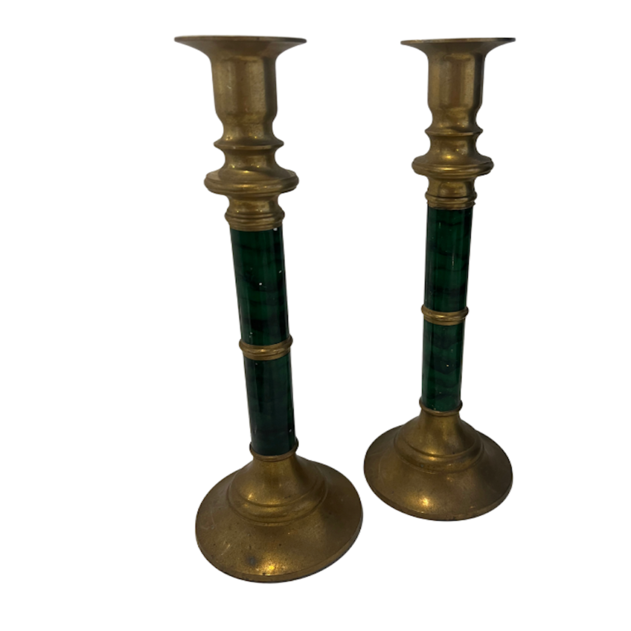 Elevate your tablescape with this exquisite pair of vintage brass candlesticks, each crowned with hand-painted faux agate details that capture the natural beauty of semi-precious stone. The warm patina of aged brass complements any décor style, from classic to contemporary, while the jewel-toned painted finishes add an unexpected touch of sophistication. Perfect for intimate dinners, special occasions, or as a refined accent piece on a console or mantelpiece.