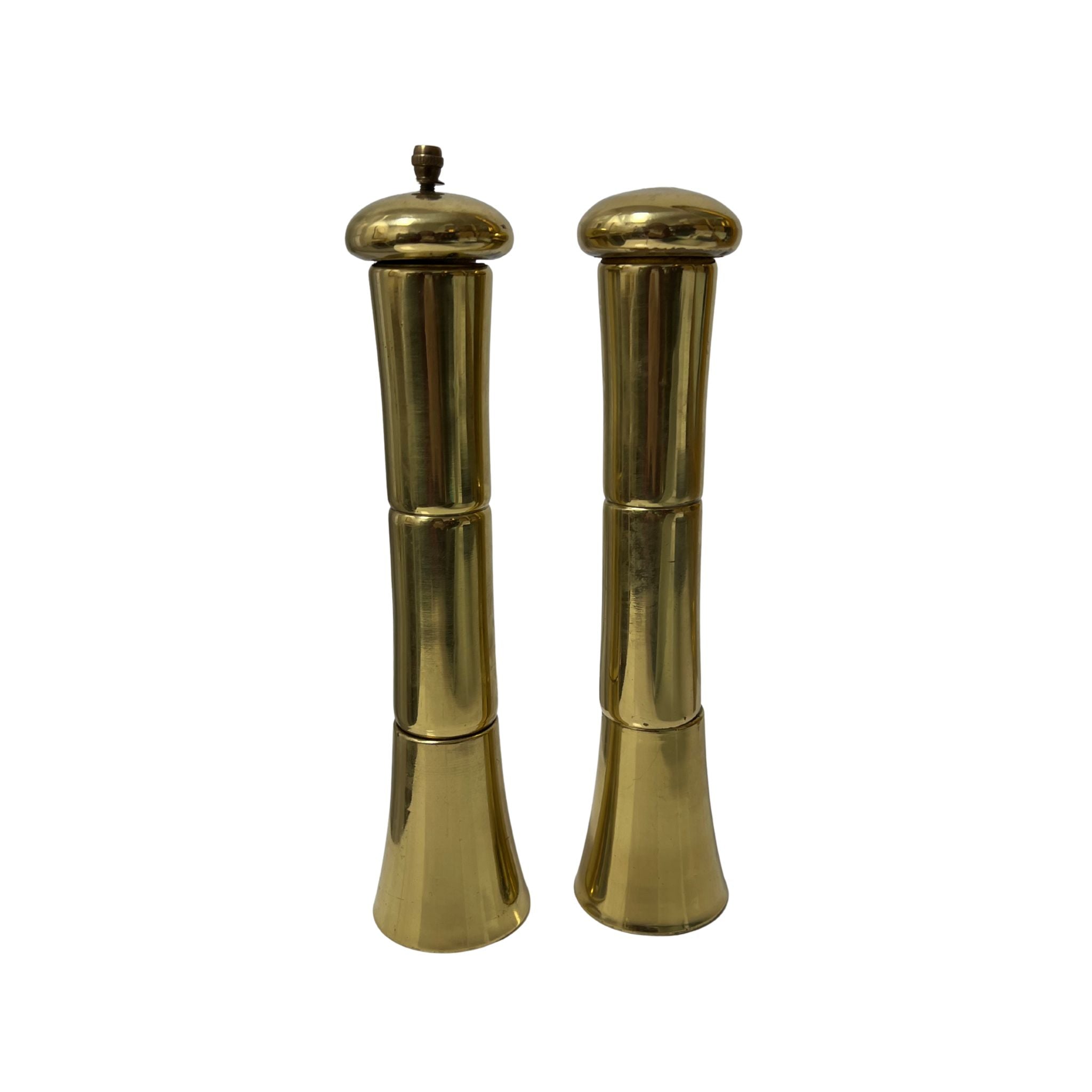 Add a touch of timeless elegance to your table with these charming vintage brass salt and pepper shakers. Crafted from warm, lustrous brass, this classic duo brings nostalgic sophistication to any dining setting. Perfect for everyday use or as a decorative accent, these shakers feature a traditional design that complements both modern and traditional décor. Their substantial weight and quality construction ensure they'll be treasured pieces in your kitchen for years to come. A delightful way to elevate your table presentation with vintage charm.